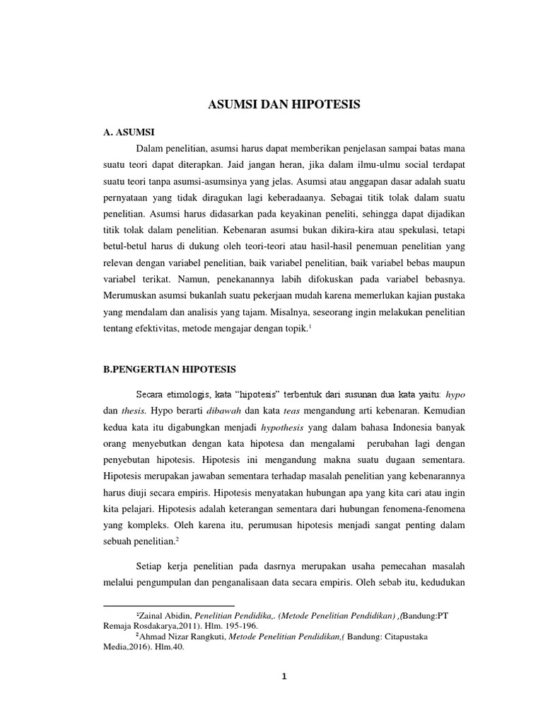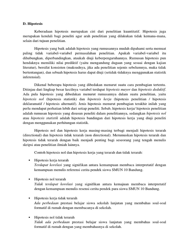 Ketika menulis karya tulis ilmiah, maka ada satu bagian yang nggak boleh terlewatkan yakni hipotesis penelitian. Contoh hipotesis komplek antara lain: Ambil contoh studi di indonesia tentang tingkat aktivitas siswa di luar kelas dan indeks prestasi. Sama halnya dengan karakteristik yang dimilikinya, sebuah hipotesis penelitian ilmiah harus bisa menjelaskan suatu fakta secara sederhana. Perlu diingat bahwa penelitian yang disajikan hanyalah salah satu contoh tujuan pembelajaran. Contoh hipotesis 2.4 hipotesis dalam sebuah metode ilmiah, setiap penelitian terhadap suatu objek hendaknya memiliki acuan hipotesis, yang berfungsi sebagai jawaban sementara yang masih harus dibuktikan kebenaran atau kesahihannnya dengan menggunakan data hasil observasi. Hipotesis adalah salah satu unsur penting dalam penelitian, terutama penelitian jenis kuantitatif. Contoh hipotesis berikut akan menunjukkan bentuk keseluruhan antara hipotesis dengan penelitian. Contoh hipotesis penelitian asosiatif contoh hipotesis penelitian asosiatif. Contoh ketiga ini, kita akan kembali membahas tentang hipotesis penelitian sosial dengan dua variabel dalam topik riset yang sama seperti di contoh pertama dana kedua. Beberapa hipotesis yang dipaparkan ini juga sering digunakan dalam penelitian sosial untuk mencari kausalitas atau sebab terjadinya fenomena sosial tertentu. Hipotesis berikutnya harus dibuktikan dahulu dengan cara pengumpulan data yang kemudian dianalisis untuk. Seorang peneliti bermaksud melakukan penelitian terhadap salah satu film yang ada di televisi, yakni film suara hati seorang istri.